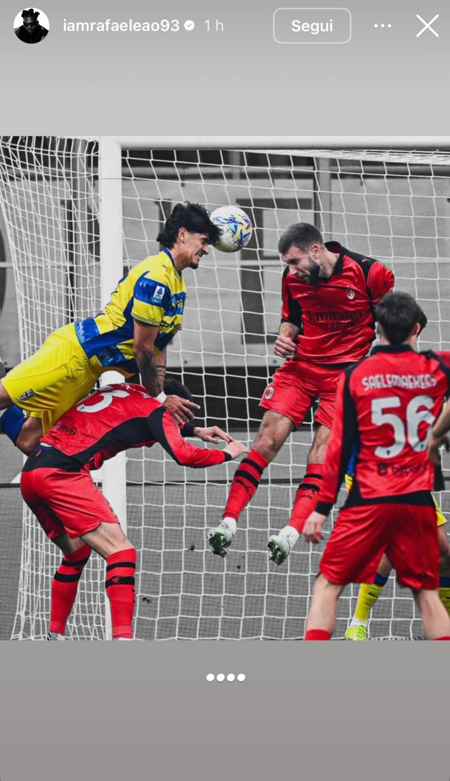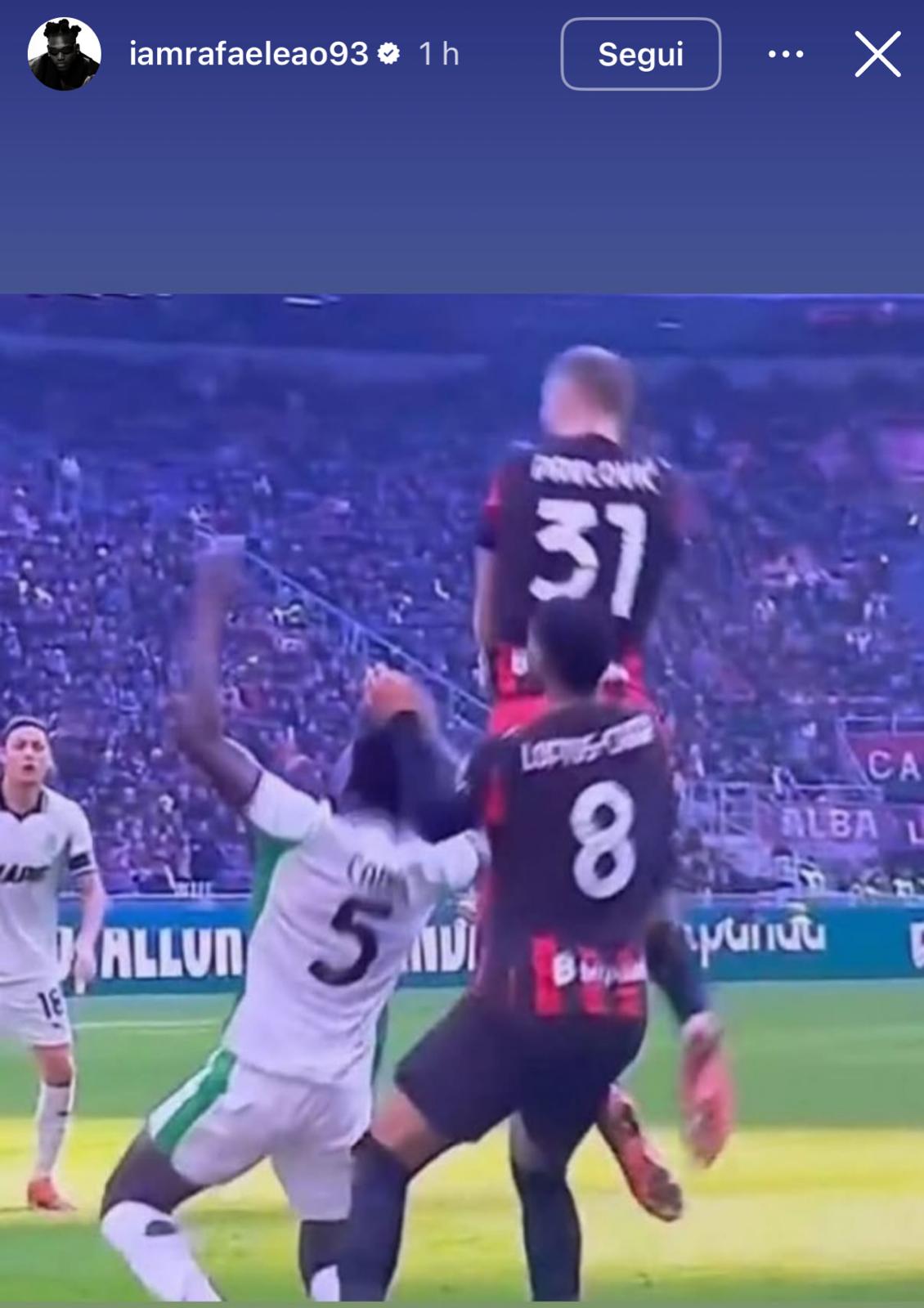 A poche ore dal triplice fischio, l’asso lusitano ha utilizzato il proprio profilo Instagram per esprimere tutto il suo disappunto. Nella prima Story pubblicata, Leao ha postato in maniera apertamente polemica un’immagine che ritrae il controverso contatto aereo tra Davide Bartesaghi e Mariano Troilo.