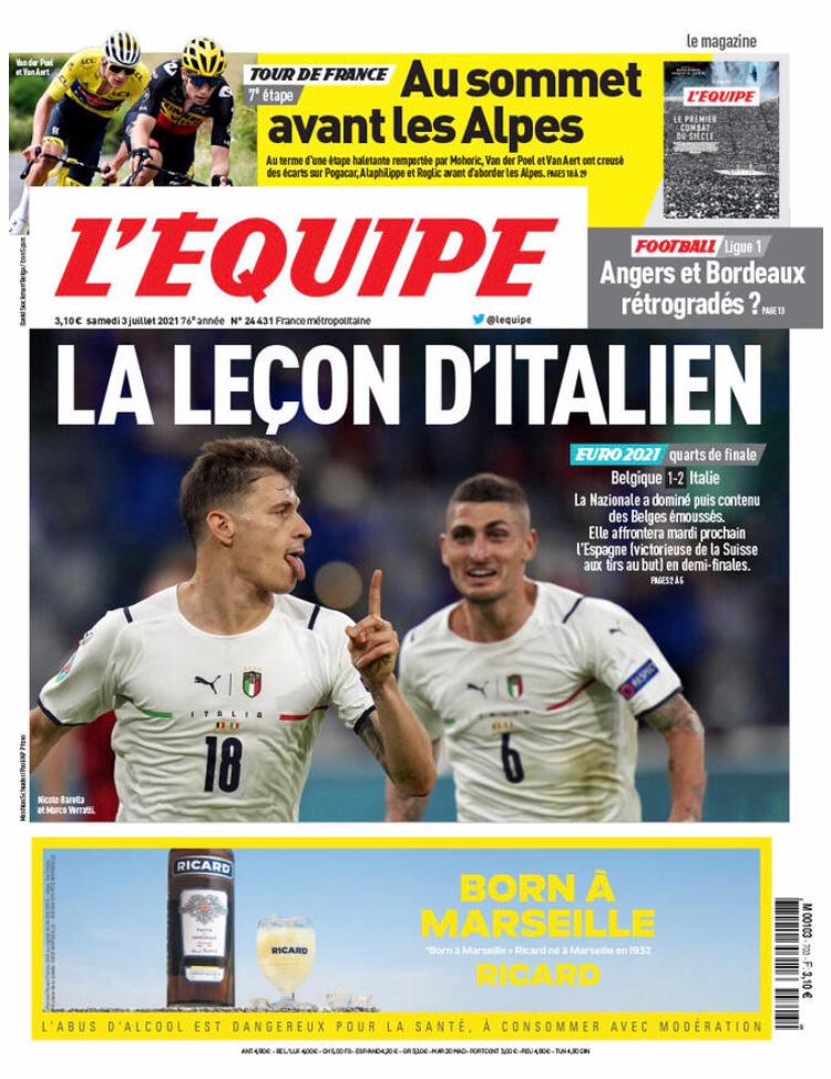 L’Equipe, quotidiano sportivo tra i più prestigioso al mondo, apre con un omaggio alla vittoria della squadra di Mancini contro il Belgio: «Lezione d’italiano» titola il giornale per la grande prestazione che porta gli Azzurri in semifinale contro la Spagna.