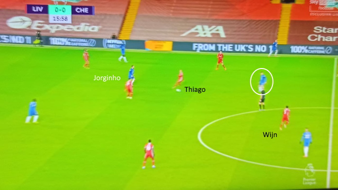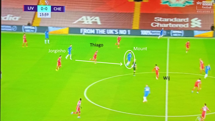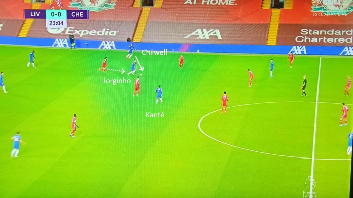 Per tutto il primo tempo, il Liverpool ha fatto una fatica enorme nel pressare centralmente la costruzione avversaria. Facendo girare palla, il Chelsea trovava quasi sempre liberi i doppi mediani. A volte bastava verticalizzare direttamente dalla difesa, mentre in altre circostanze si allargava il gioco sugli esterni per poi tornare dentro: il risultato è che i blues hanno trovato liberi quasi sempre Jorginho e Kanté (quasi 130 passaggi complessivi tra i due).