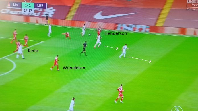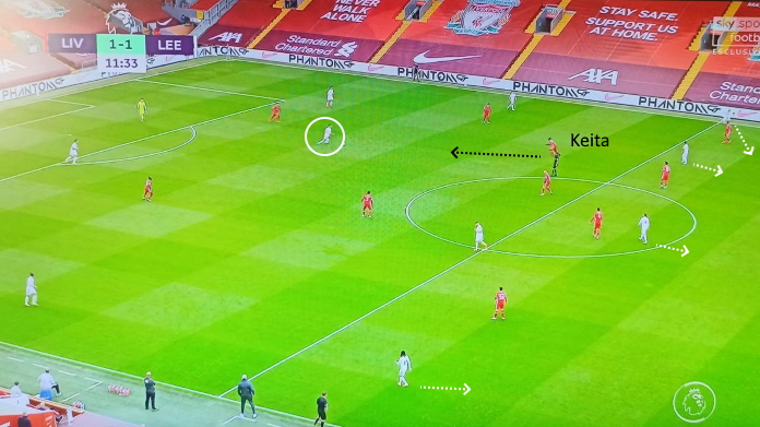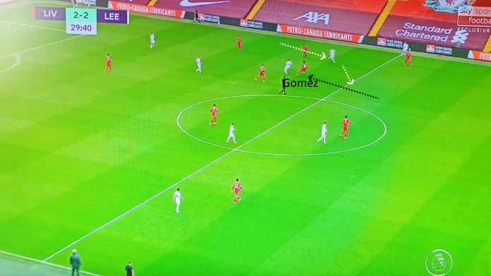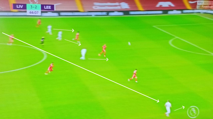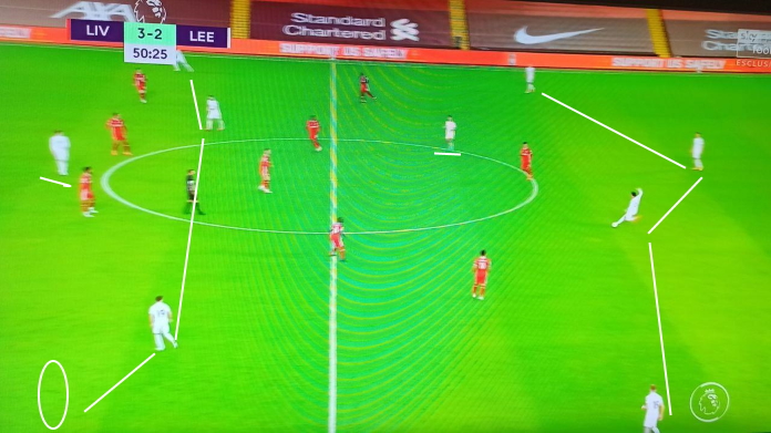 Va rilevato come il 4-1-4-1 Leeds occupasse il fronte d’attacco con tanti uomini: i difensori del Liverpool erano quindi sempre esposti alla verticalità avversaria, visto che c’erano continue situazioni di palla scoperta. Il portatore avversario non aveva pressione addosso, difensori e mediano del Leeds disponevano quasi sempre di tempo e spazio per lanciare in avanti (soprattutto in fascia). Svuotavano il centrocampo per poter velocemente arrivare nella trequarti rivale. Il Liverpool era spesso in ritardo nel pressing e pativa su ogni cambio di gioco degli ospiti.