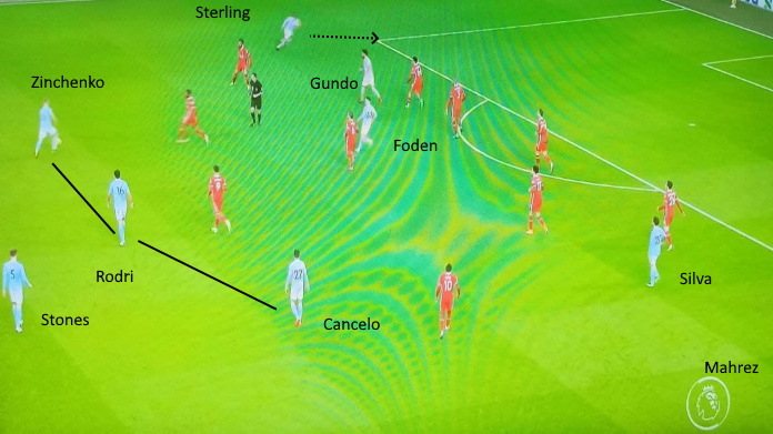 Naturalmente, lo scaglionamento del Manchester City si è distinto, come al solito, per tanta fluidità. C’erano continue rotazioni tra i giocatori per non dare punti di riferimento agli avversari. Capitava quindi, per esempio, che Zinchenko e Cancelo si sovrapponessero in fascia, con le ali che si stringevano. A sinistra, poi, Foden e Sterling si sono spesso scambiati di posizione.