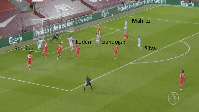 Si è visto chiaramente nel match di Anfield. Le ali, Sterling e Mahrez, davano ampiezza, ricoprivano una posizione molto larga. In mezzo, c’era invece tanta fluidità, con il centro dell’attacco che solitamente era occupato da Gundogan, Bernardo Silva e Foden. Per quanto spesso si abbassassero, soprattutto i primi due, nella fase di costruzione per dare ai compagni soluzioni di passaggio, quando il Manchester si stabiliva nella trequarti rivale diventavano gli attaccanti citizens.