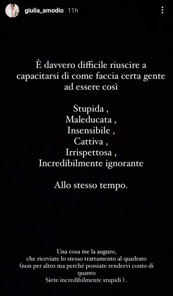 «È davvero difficile riuscire a capacitarsi di come faccia certa gente ad essere così stupida, maleducata, insensibile, cattiva, irrispettosa, incredibilmente ignorante allo stesso tempo. Una cosa me la auguro, che riceviate lo stesso trattamento al quadrato (non per altro ma perché possiate rendervi conto di quanto siete incredibilmente stupidi)».