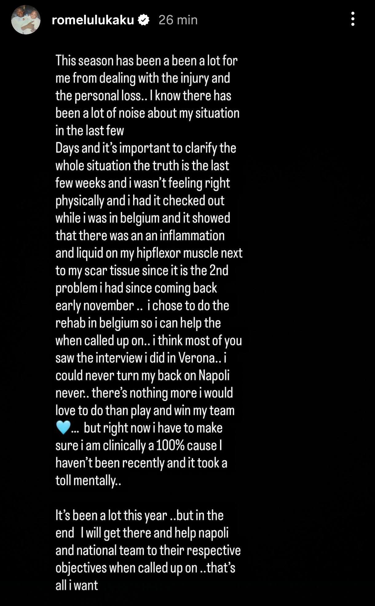 Romelu Lukaku ha scelto i social per chiarire la propria situazione dopo i dubbi emersi negli ultimi giorni sul mancato ritorno a Napoli. L’attaccante belga ha spiegato di aver attraversato un periodo molto complicato, segnato da problemi fisici e personali, precisando di non essersi sentito bene nelle ultime settimane. Dai controlli svolti in Belgio è emersa un’infiammazione con presenza di liquido nella zona del flessore dell’anca, vicino alla cicatrice del precedente infortunio. Per questo ha deciso di proseguire la riabilitazione lontano dall’Italia, con l’obiettivo di tornare al 100% e rendersi di nuovo utile al Napoli e alla nazionale non appena sarà pronto.