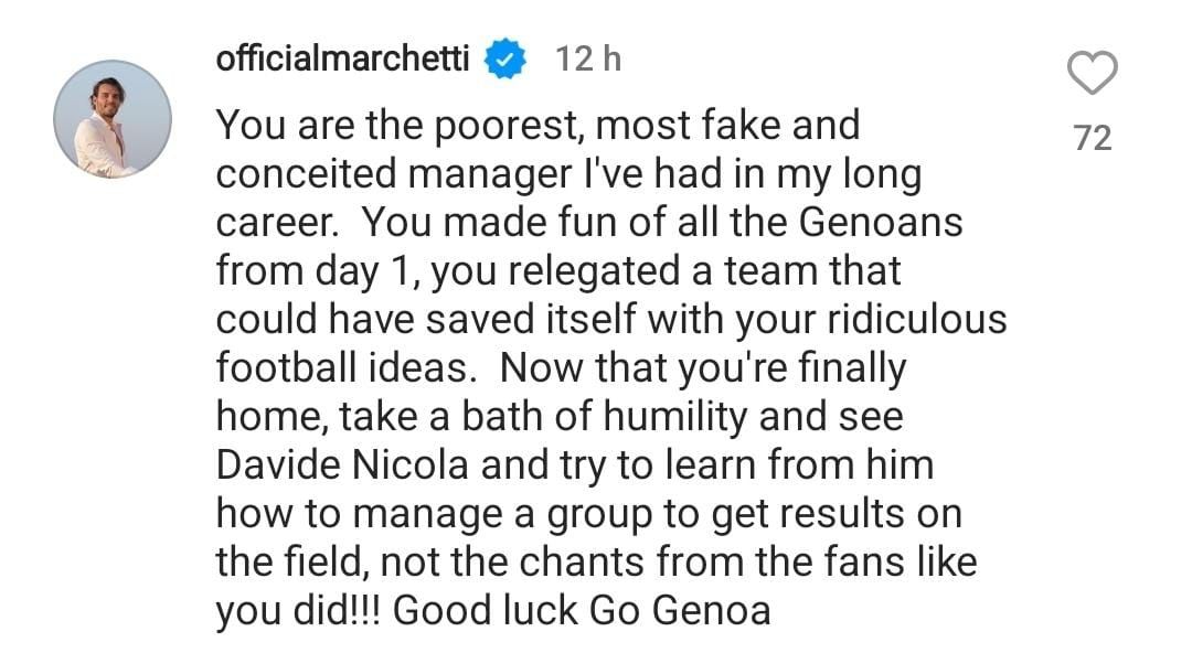 «Sei il più scarso, falso e presuntuoso fra gli allenatori che ho avuto in carriera. Hai preso in giro tutti i tifosi del Genoa dal primo giorno, hai fatto retrocedere una squadra che senza le tue idee calcistiche ridicole si sarebbe potuta salvare. Ora che finalmente te ne sei tornato a casa, fatti un bagno di umiltà, guarda Davide Nicola e cerca di imparare da lui come si gestisce un gruppo per ottenere i risultati sul campo, e non i cori dei tifosi, come invece tu hai fatto! Buona fortuna, e forza Genoa».