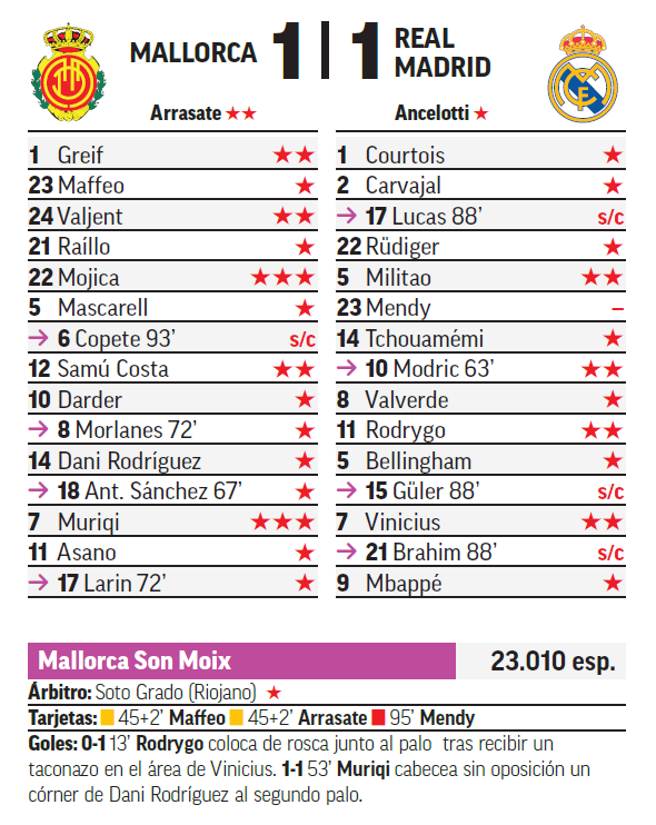Contro il Maiorca le Merengues non vanno oltre all’1-1: al gol iniziale di Rodrygo – azione in cui i Fab Four del Real toccano tutti il pallone – risponde l’ex laziale Muriqi nel finale. Come ha giocato però la nuova stella di Florentino Perez? Per Marca la sua prestazione merita una stella – il quotidiano spagnolo utilizza le stelle invece dei voti – insomma, non proprio il debutto dei sogni.