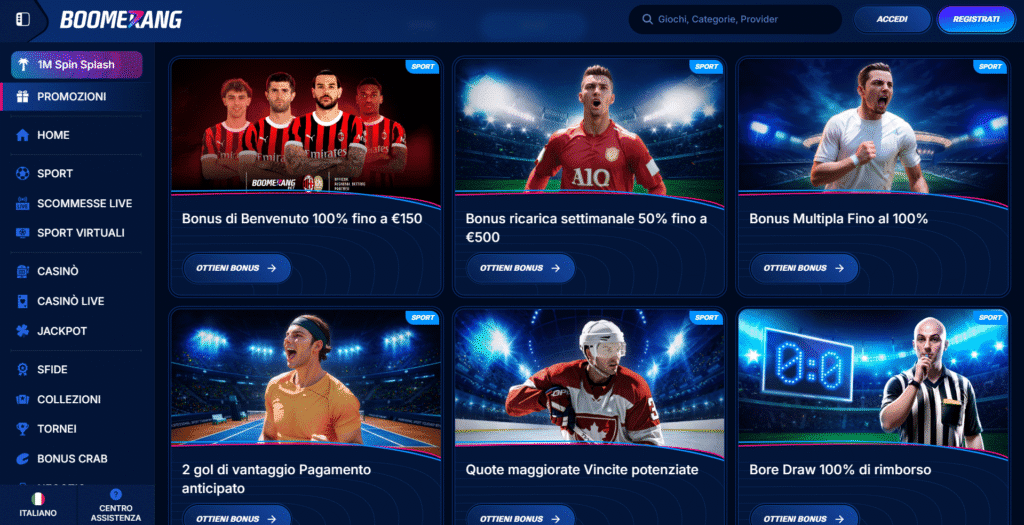 Boomerang è tra i bookmaker non AAMS con prelievo immediato più affidabili sul mercato. Offre oltre 30 sport su cui scommettere, payout elevati e prelievi evasi in meno di 24 ore tramite e-wallet e criptovalute. Ottima la sezione live e i cashout flessibili.