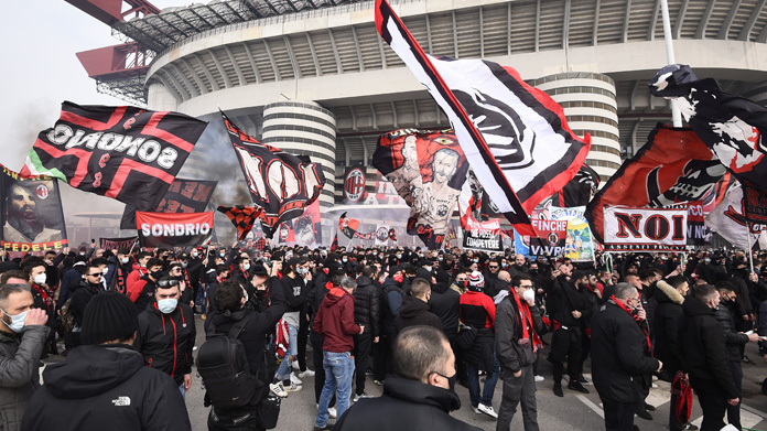 I tifosi di Milan e Inter si sono radunati all’esterno di San Siro a poche ore dal calcio d’inizio del derby. Ecco le immagini