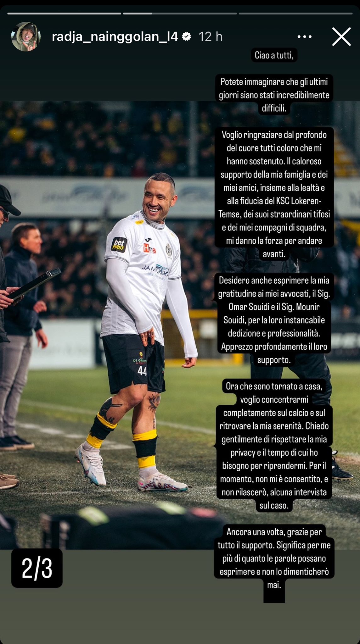 «Ciao a tutti. Potete immaginare che gli ultimi giorni siano stati incredibilmente difficili. Voglio ringraziare dal profondo del cuore tutti coloro che mi hanno sostenuto. Il caloroso supporto della mia famiglia e dei miei amici, insieme alla lealtà e alla fiducia del KSC Lokeren-Temse, dei suoi straordinari tifosi e dei miei compagni di squadra, mi danno la forza di andare avanti. Desidero esprimere la mia gratitudine ai miei avvocati, il sig. Mounir Souidi, per la loro instancabile dedizione e professionalità. Apprezzo profondamente il loro supporto. Ora che sono tornato a casa, voglio concentrarmi completamente sul calcio e sul ritrovare la mia serenità. Chiedo gentilmente di rispettare la mia privacy e il tempo di cui ho bisogno per riprendermi. Per il momento, non mi è consentito, e non rilascerò, alcuna intervista sul caso. Ancora una volta, grazie per tutto il supporto. Significa per me più di quanto le parole possano esprimere e non me lo dimenticherò mai».