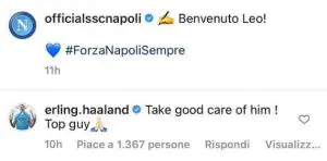 Haaland ha commentato l’arrivo di Ostigard al Napoli sui social della squadra azzurra: «Prendetevi cura di lui. É un ragazzo top»