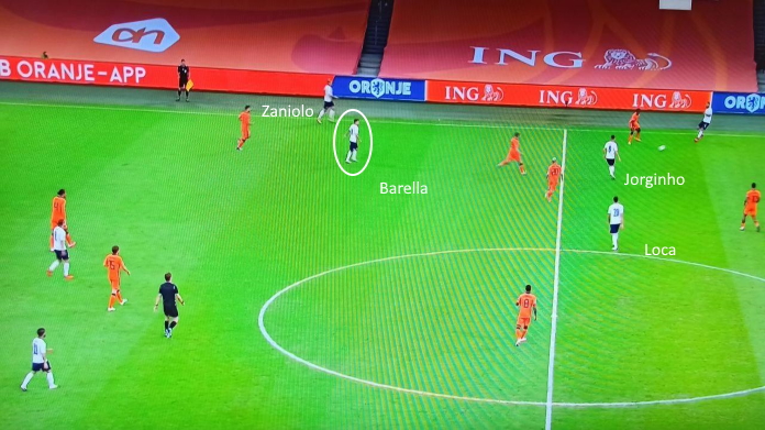 Due situazioni in cui l’Italia trova Barella alle spalle di un centrocampo olandese in grosso affanno nel pressing. Nel primo caso, Bonucci verticalizza su di lui infilando De Jong alla propria sinistra. Il mediano del Barcellona è isolato perché De Roon si è alzato per accorciare su Locatelli. Nella seconda slide, Barella si posiziona intelligentemente vicino a Zaniolo. In tal modo, dopo il passaggio di Jorginho per il talento della Roma, c’è una situazione di superiorità numerica contro il difensore dell’Olanda.