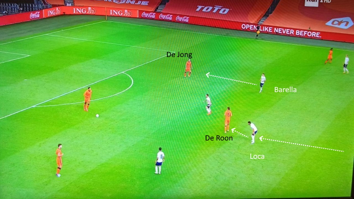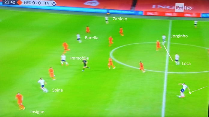 L’Italia ha disputato un match di grande personalità e qualità anche in fase di non possesso. Gli azzurri hanno aggredito con grande organizzazione la costruzione olandese, i quali hanno molto faticato a risalire palla a terra. De Jong e De Roon si abbassavano spesso per supportare Van Dijk e Veltman, ma Barella e Locatelli erano precisi nell’accorciare su di loro.