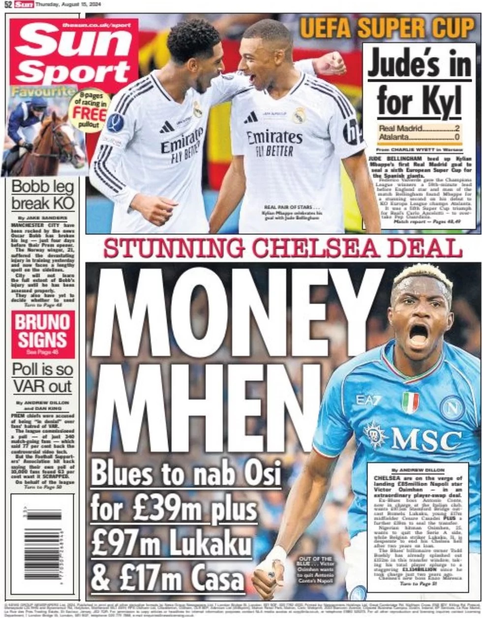 Inizia oggi la Premier League, ma il Sun dedica la prima pagina a Victor Osimhen: il Chelsea infatti ha preparato l’offerta per strappare il sì del Napoli – Manna ieri era a Londra proprio per imbastire la trattativa – e portare in Blues il nigeriano.