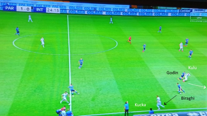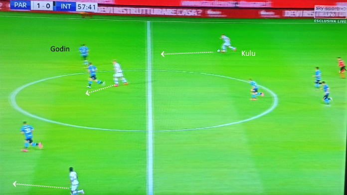Una delle molte ripartenze del Parma, addirittura in superiorità numerica (anche se Barella sta rientrando). Godin resta bloccato, Kulusevski può ricevere e puntarlo. Inter lunga nelle transizioni difensive.