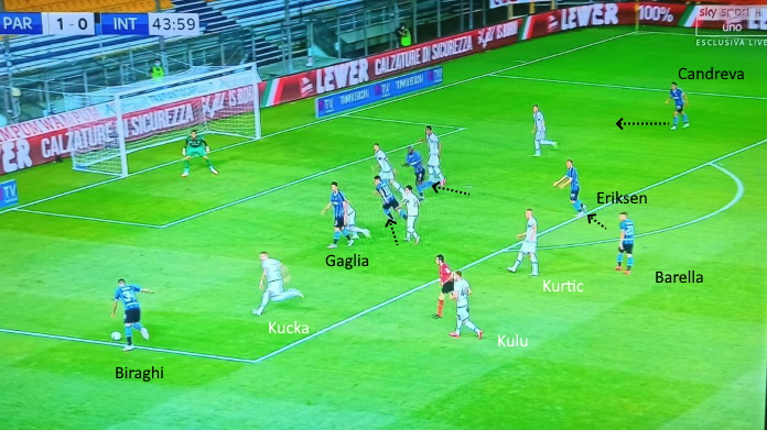 Nella slide sopra, per esempio, l’Inter serve Biraghi in corsa in una zona potenzialmente molto pericolosa, con l’area piena di giocatori offensivi. L’ex Fiorentina sbaglia però le misure del cross. Considerando che il Parma protegge bene la propria area, forse l’Inter avrebbe potuto mettere più palloni per l’uomo a rimorchio: così, nel secondo tempo, Eriksen ha costruito una delle principali occasioni da gol.