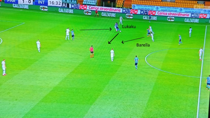 Un esempio in questo caso: Lukaku si defila e Barella attacca lo spazio centrale creato.