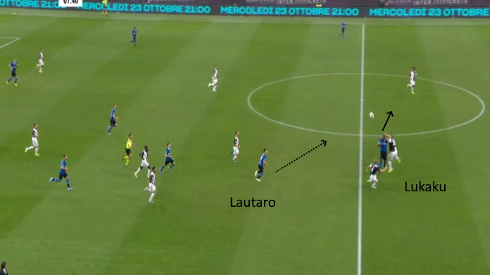 L’Inter di Conte sfrutta tantissimo le punte sia per risalire che per rifinire. Qui, su un lancio lungo da dietro per Lukaku, Lautaro legge in anticipo la giocata del compagno, attaccando bene lo spazio per raccogliere la sponda.