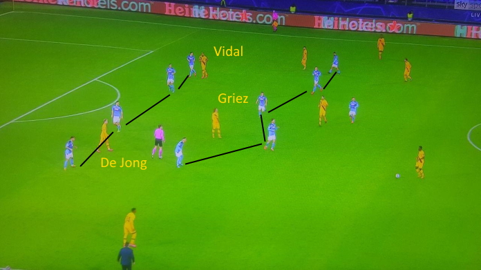 Il Barcellona ha sbattuto contro il muro eretto dal Napoli. Squadra statica e poco movimento senza palla, con grosse difficoltà a trovare l’uomo tra le linee. Vidal e de Jong occupano il centro dell’attacco, con Griezmann leggermente più arretrato.