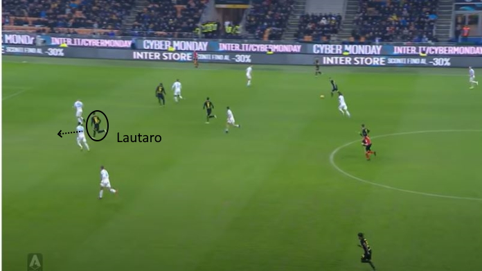Lautaro viene incontro al portatore e premia bene l’inserimento del compagno. Il suo prezioso movimento fa risalire la squadra.