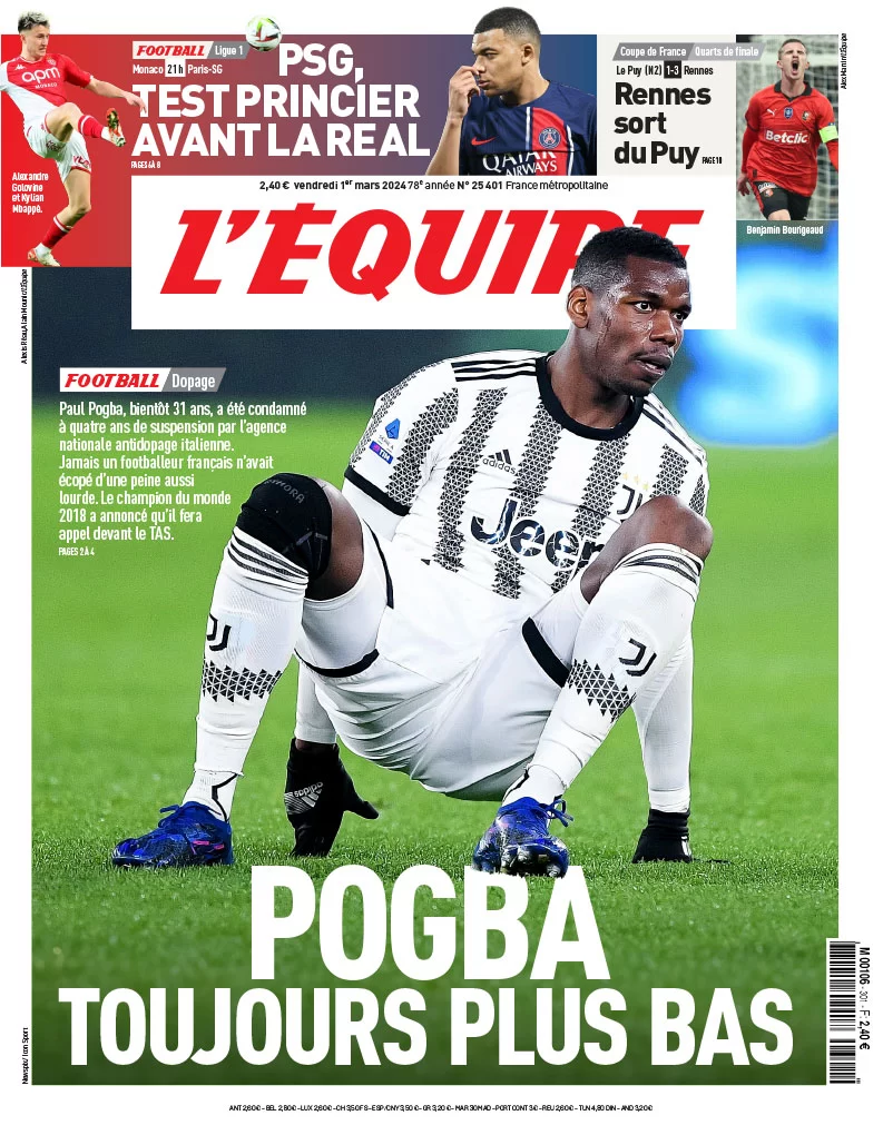 La notizia di Paul Pogba ha fatto il giro del mondo in pochissime ore e anche L’Equipe dopo la squalifica ha messo in prima pagina il centrocampista