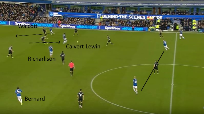 Tuttavia, con gli attaccanti che giocano molto vicini alle ali, si stanno vedendo anche combinazioni interessanti sul breve, con Ancelotti che incoraggia fraseggi tra le linee. Una delle situazioni tipo si vede nella slide sottostante: la prima punta (Calvert-Lewin) viene incontro, attirando il difensore centrale avversario fuori posizione. Walcott, l’ala, è già pronto ad aggredire lo spazio creatosi (da notare a sinistra la posizione di Bernard, che resta abbastanza stretto: Digne andrà poi in sovrapposizione).