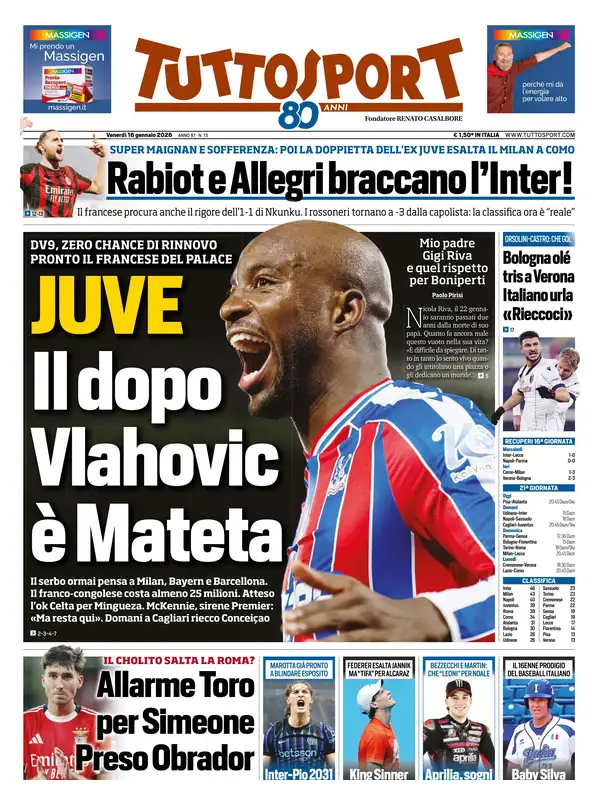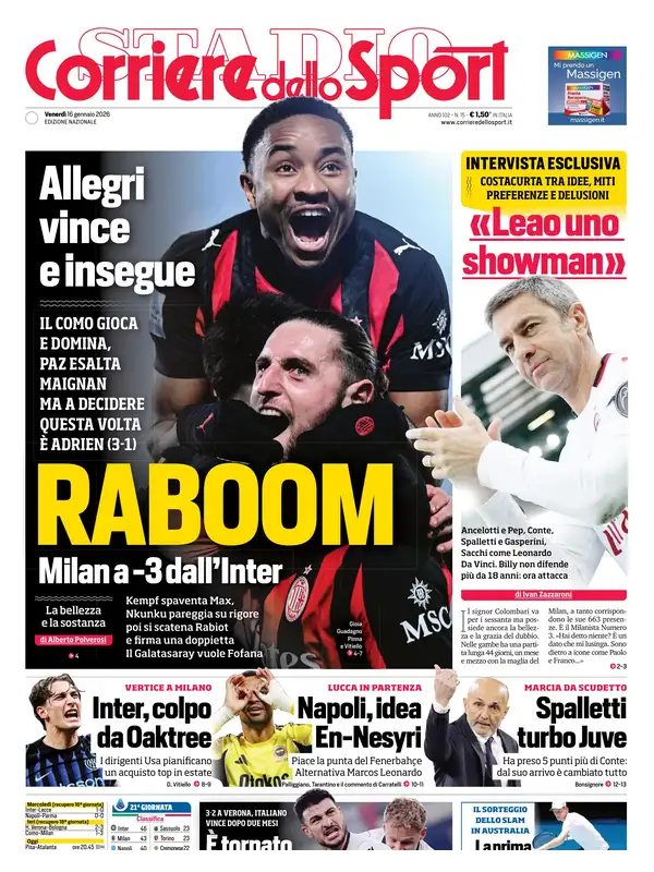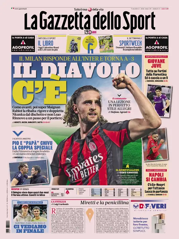 Le prime pagine dei quotidiani sportivi – 16 gennaio 2026