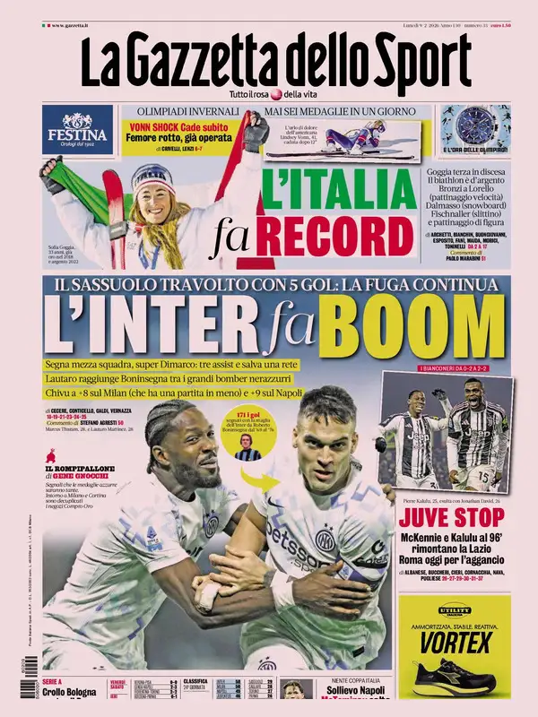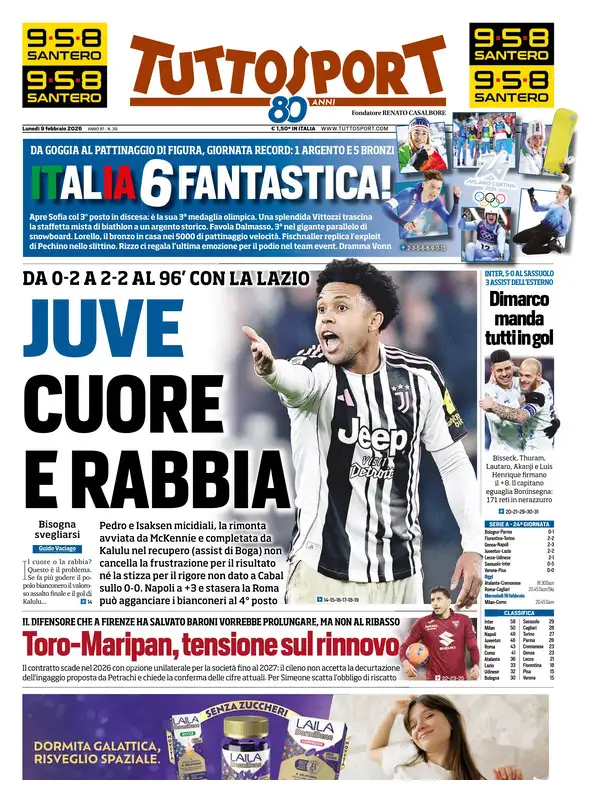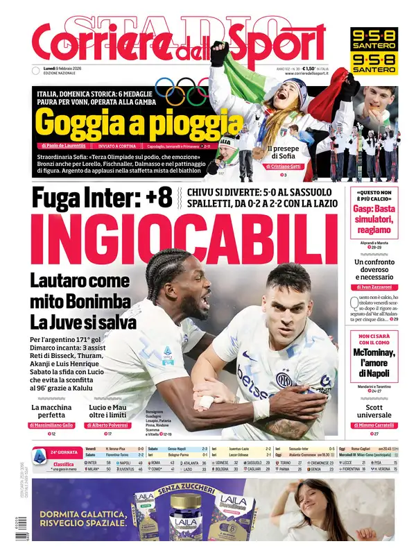 Le prime pagine dei quotidiani sportivi – 9 febbraio 2026