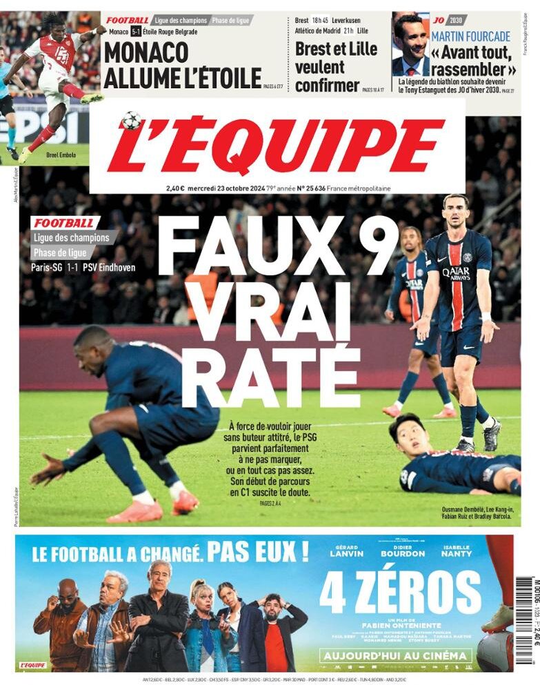 La prima pagine dell’Equipe dopo il pareggio in Champions League in rimonta del PSG con il PSV: nel mirino delle critiche il falso 9 di Luis Enrique