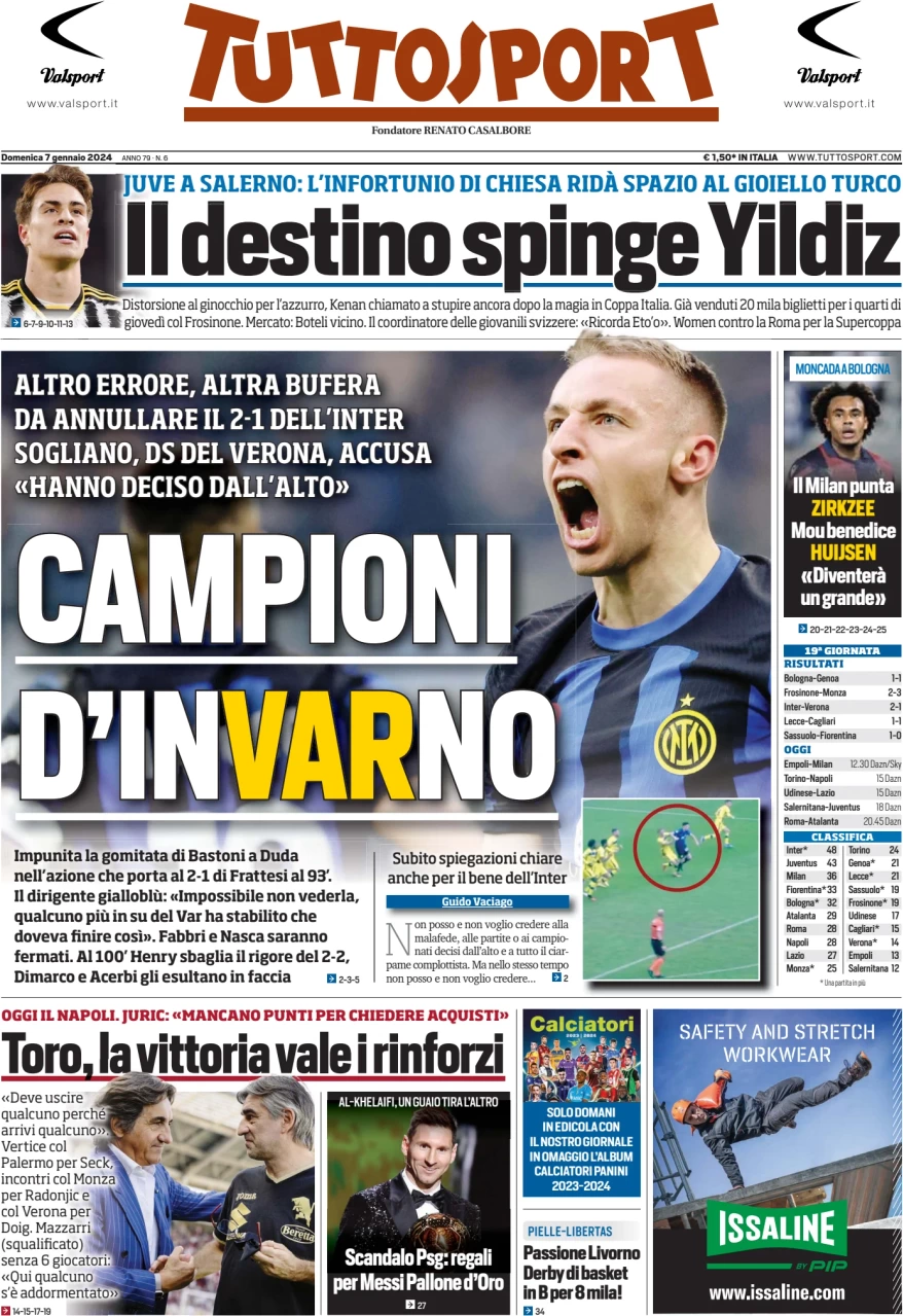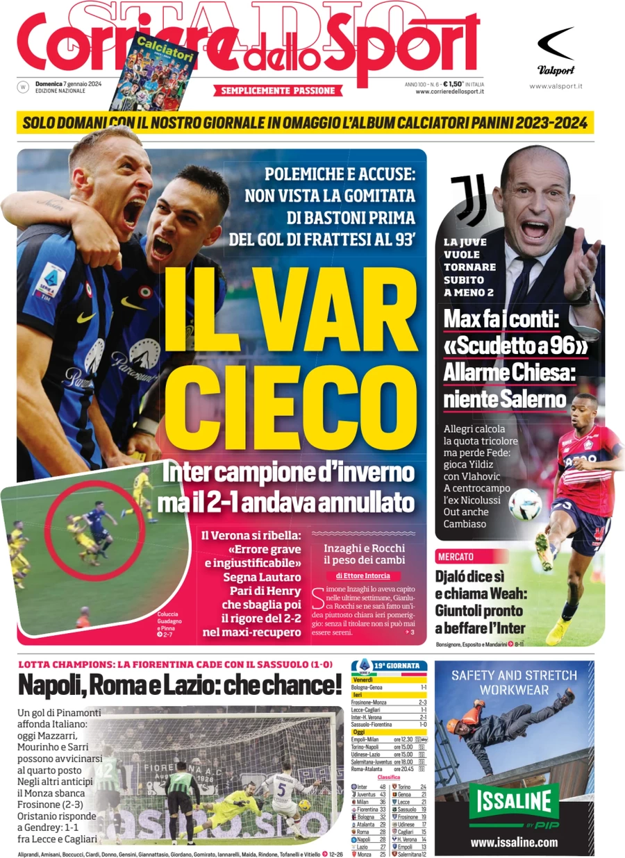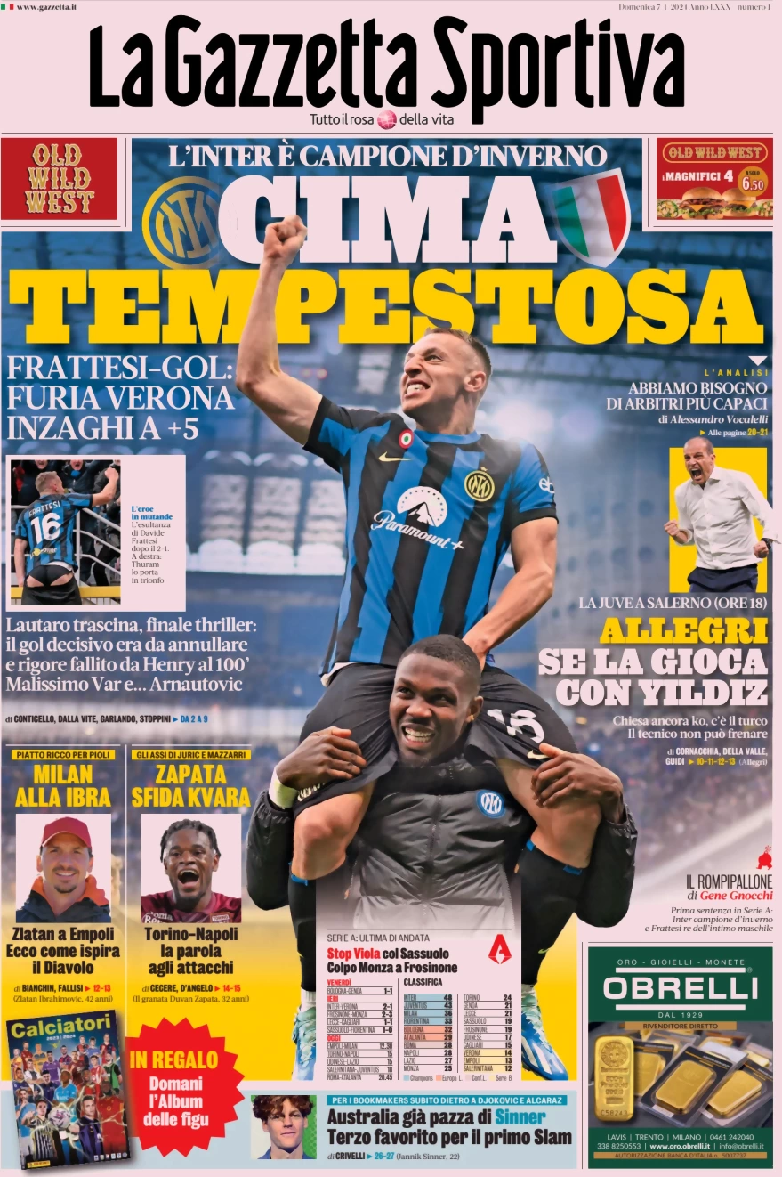 Una rassegna stampa delle prime pagine sportive nazionali di oggi, 7 gennaio: Gazzetta dello Sport, Corriere, Tuttosport