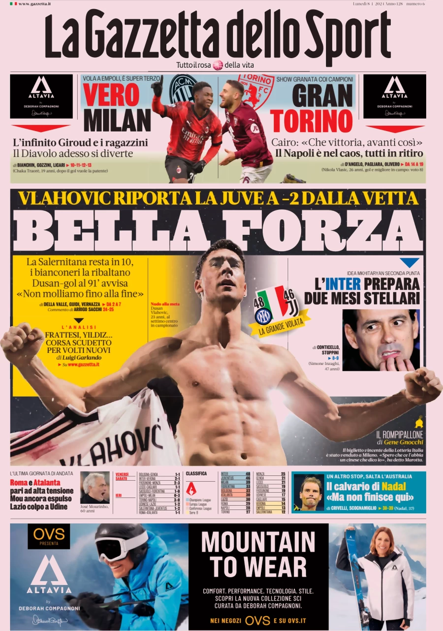 Una rassegna stampa delle prime pagine sportive nazionali di oggi, 8 gennaio: Gazzetta dello Sport, Corriere, Tuttosport
