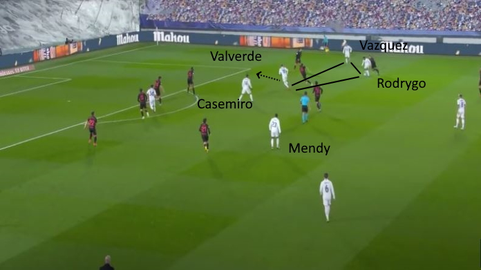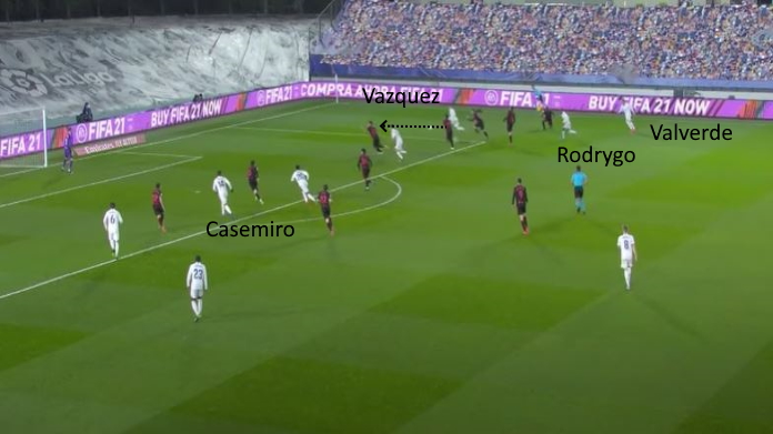 Zidane è corso ai ripari cambiando addirittura l’intero reparto offensivo: Rodrygo, Hugo Duro e Vinicius hanno sostituito Isco, Mariano e Asensio. Il Madrid è così tornato a un 4-3-3 più classico che ha di nuovo schiacciato gli avversari. Con il centro bloccato dalla Real Sociedad, i blancos hanno provato a rifinire soprattutto in fascia (ben 16 cross nel secondo tempo). Con due ali, Rodrygo e Vinicius, che amano ricevere larghe, abbiamo visto tanti triangoli – soprattutto a destra – con mezzala e terzino.