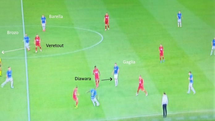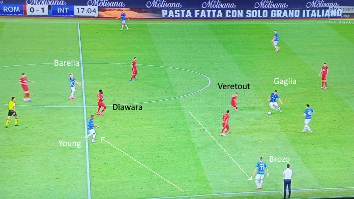 Nella seconda azione, invece, Brozovic si apre sulla linea di fondo mentre Young si stringe dentro al campo: si invertono praticamente di posizione. La Roma non riesce a leggere questa rotazione, con Diawara che si trova in inferiorità numerica e non è supportato da Bruno Peres: l’ex Manchester viene trovato libero.