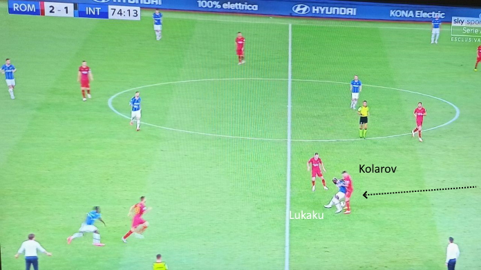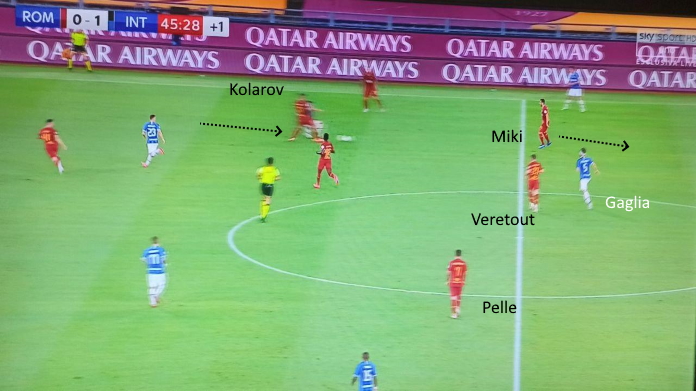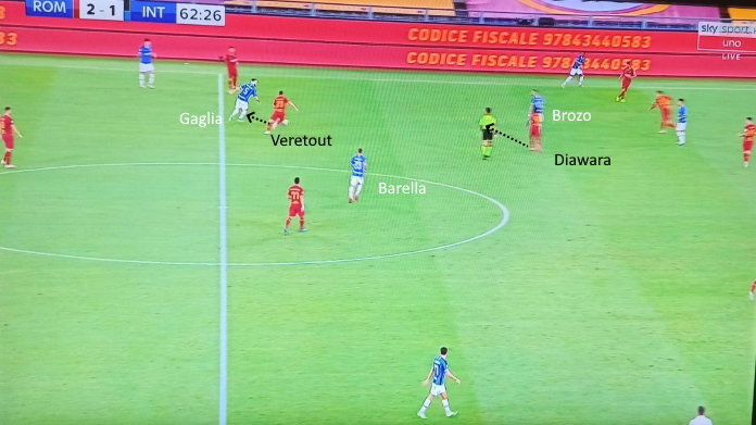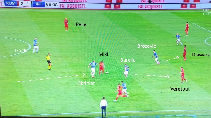 Si è vista ampia mobilità e molte rotazioni da parte dei centrocampisti. Per quanto Brozovic a volte si abbassasse, in generale ha ricoperto una posizione più avanzata (da mezzala), con Gagliardini davanti alla difesa. Tante volte l’Inter ha trovato l’uomo libero dietro i mediani giallorossi, grazie a ottimi smarcamenti e scambi di posizione non letti dagli avversari.