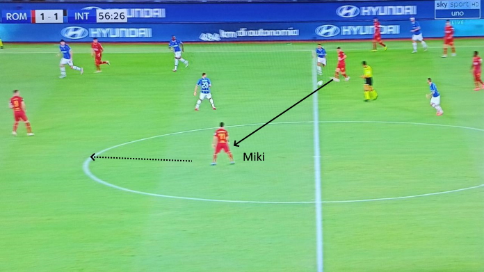 Un esempio qui. Mkhitaryan viene incontro e apre il gioco su Pellegrini, in tal modo la Roma supera il pressing dell’Inter.