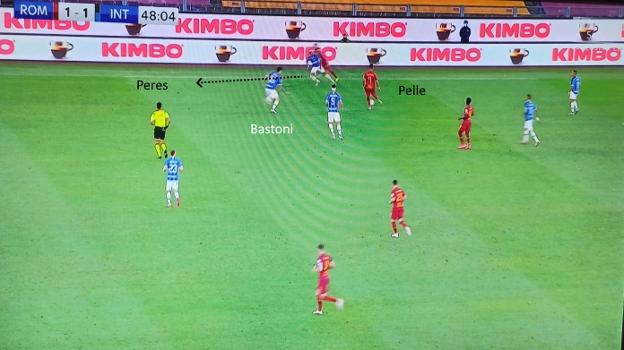 La Roma ha sfruttato bene lo spazio alle spalle di Young. Le combinazioni tra Pellegrini e Bruno Peres funzionavano: l’ex Sassuolo si defilava vicino al brasiliano, lanciandolo poi in profondità alle spalle dell’inglese. Il problema è che Peres è stato molto impreciso al momento del cross, di conseguenza i giallorossi non hanno sfruttato bene la fascia destra in zona di rifinitura. Perlomeno, questa giocata ha spesso consentito di superare il pressing interista.