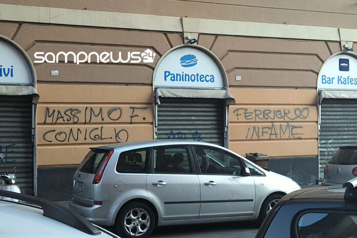 Sono comparse nuove scritte oggi pomeriggio a Genova, nel quartiere Marassi. Questi gli insulti rivolti al numero uno della Doria: «Massimo F. coniglio» e «Ferrero infame».