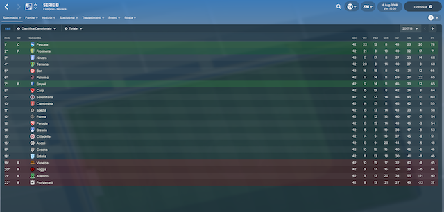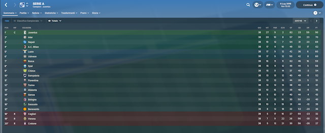 A vincere la Serie A è stata la Juventus. Per il settimo anno di fila i bianconeri hanno trionfato in Italia. Forti dell’arrivo di Felipe Anderson e di Franco Vazquez, i piemontesi hanno guardato dall’alto in basso quasi tutte le avversarie. Seconda l‘Inter a ben venti punti di distanza, terzo il Napoli, che nel videogioco ha segnato molto meno rispetto alla realtà. Sorpresa al quarto posto, è il Milan a andare in Champions League: i rossoneri partono male ma, udite udite, è decisivo l’esonero di Montella il 30 dicembre. Nel girone di ritorno è Paulo Sousa a guidare il Diavolo e a issarlo al quarto posto. Male la Roma, settima, mentre la Lazio arriva quinta. Sorprende l’Udinese in Europa League, la Spal invece chiude con un ottavo posto super. Retrocedono Verona, Cagliari e Crotone. Gonzalo Higuain capocannoniere con 22 e decisivo anche in finale di Coppa Italia, dove la Juventus batte la Lazio 1-0 col gol del Pipita. Dalla Serie B invece salgono il Pescara di Zeman e il Frosinone, si unisce l’Empoli dai playoff.