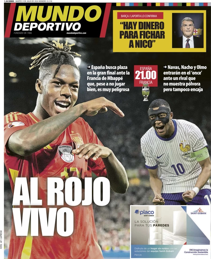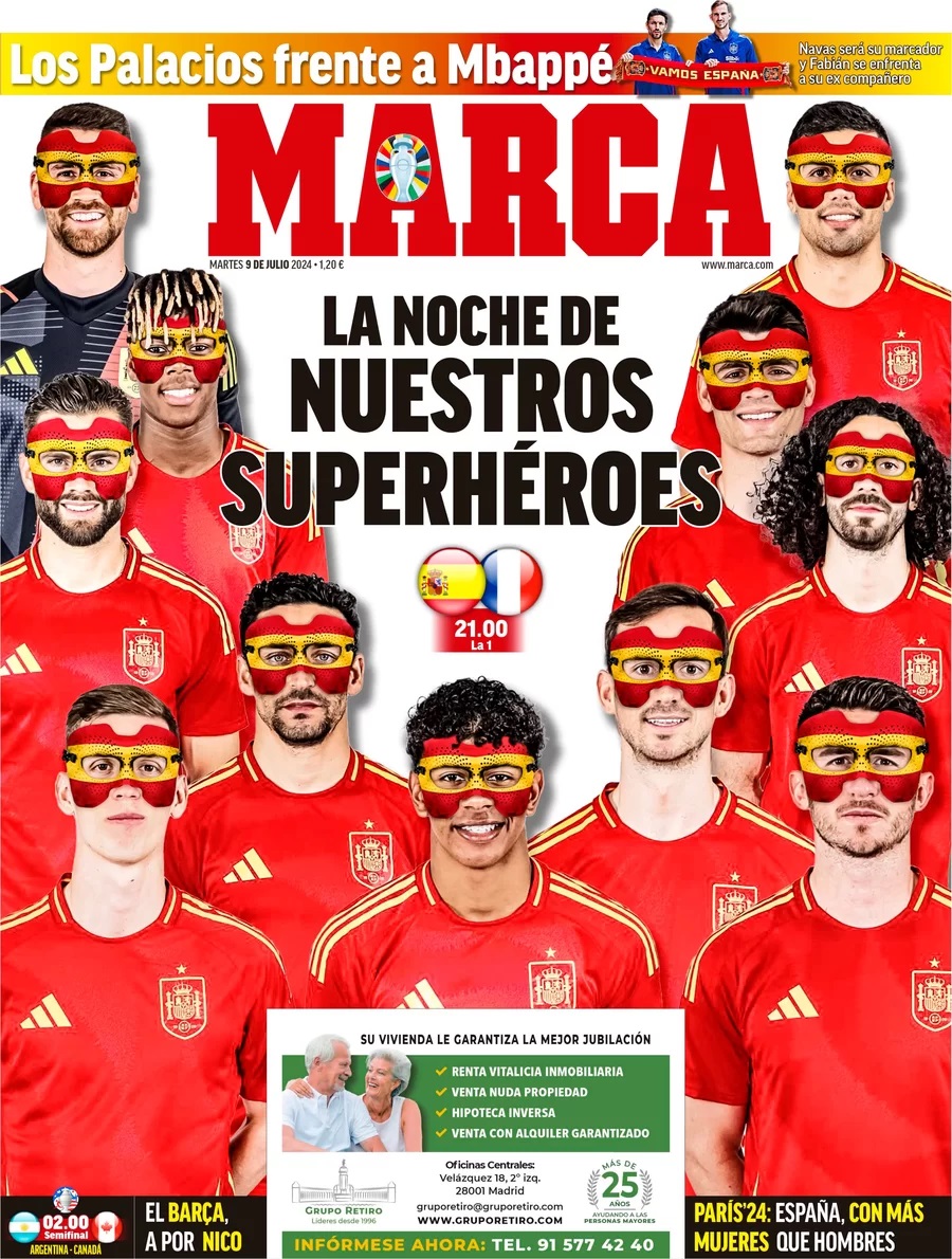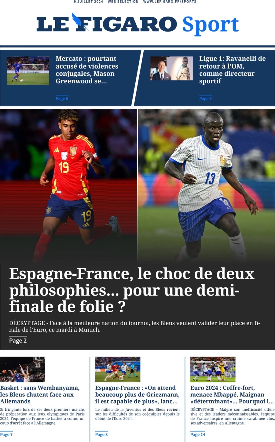 Questa sera a Monaco di Baviera Spagna e Francia si giocano l’accesso alla finale di Euro 2024. Le prime pagine dei quotidiani spagnoli e francesi introducono la sfida ovviamente da angoli diversi, ma con alcune similitudini: sia L’Equipe che Marca scelgono due foto del collettivo. I parigini, glissando sulla crisi di gol dei Blues, si concentrano sulla difesa (un solo gol subito su rigore) e titolano “No pasaran“, non passeranno. I madrileni rispondo con l’11 delle Furie Rosse, mascherato alla Mbappé e titolano “La notte dei nostri supereroi“. Le Figaro e Mundo Deportivo invece scelgono il duello individuale: per i francesi la chiave sarà Kante contro Yamal, mentre per i catalani, già in clima Clasico, Nico Williams (obiettivo di mercato del Barça) e Mbappé, nuova stella del Real.