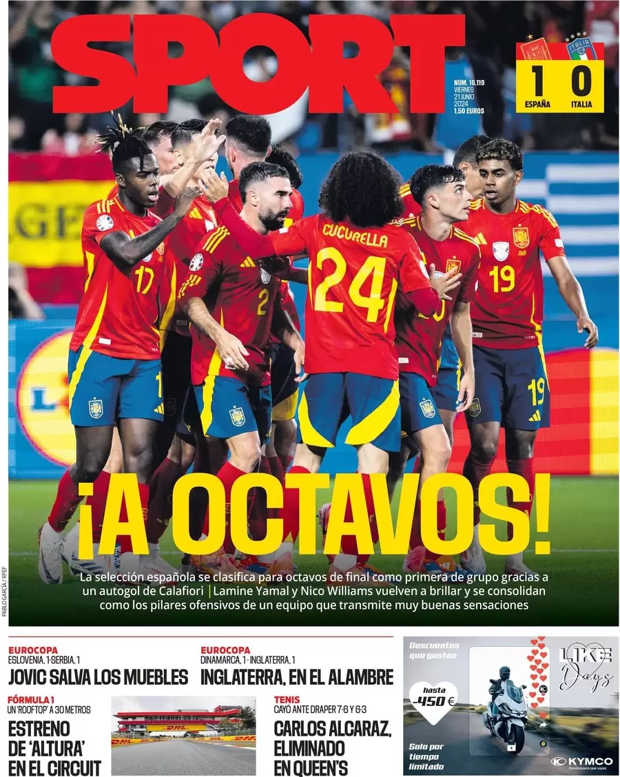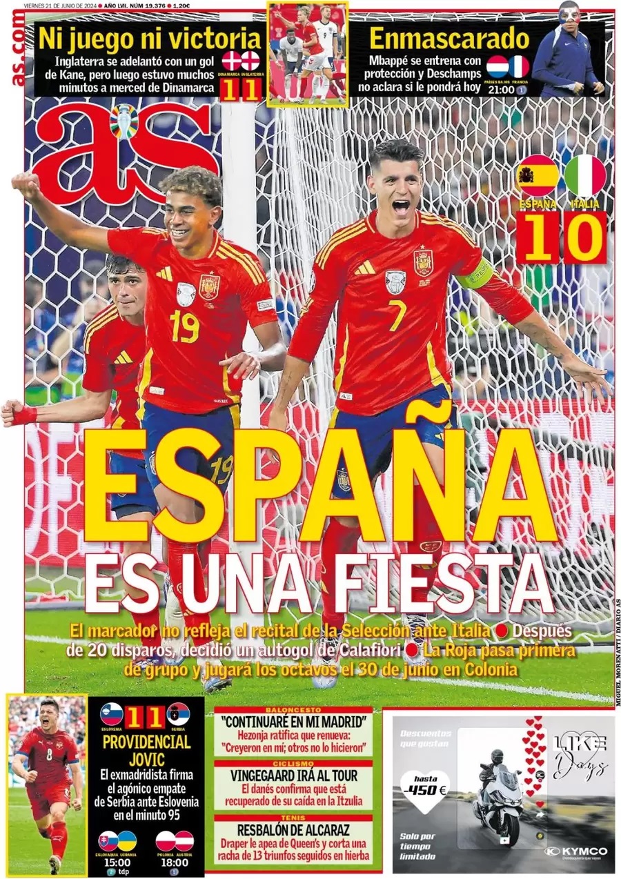 Mentre sulle prime pagine dei giornali italiani la sconfitta dell’Italia è stata accolta con grande pessimismo, in Spagna i quotidiani sportivi si lasciano travolgere dall’entusiasmo: la nazionale di De La Fuente è già agli ottavi di Euro 2024, da prima del girone e mettendo in mostra un calcio di grande efficacia. Di seguito le prime pagine di Marca, Sport, As e Mundo Deportivo.
