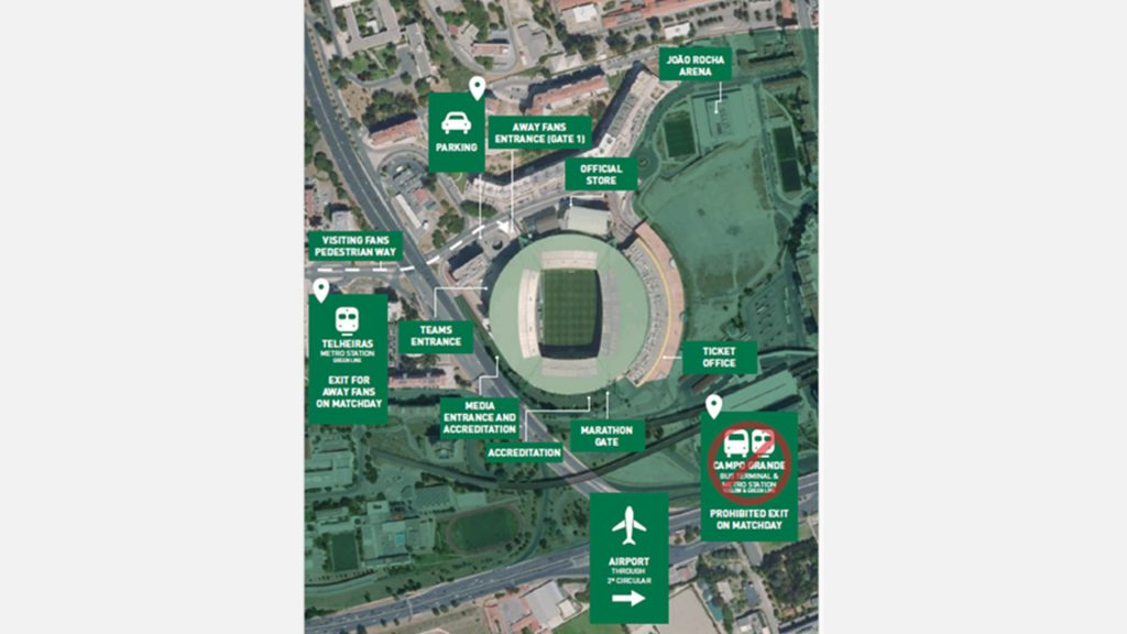 Come comunicato dallo Sporting, si segnala che l’ingresso del Settore ospiti dello stadio José de Alvalade (Rua Professor Fernando da Fonseca, 1501-806 Lisboa) è il GATE V.