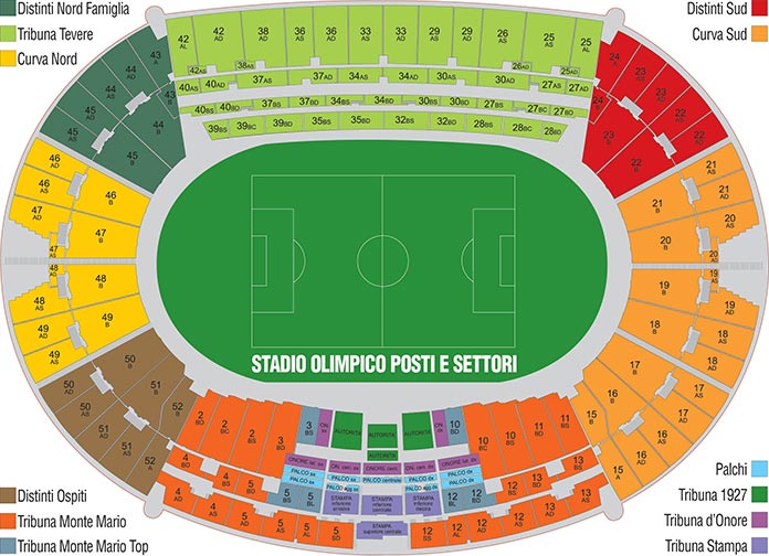 Lo stadio Olimpico è suddiviso in diversi settori: la Tribuna Monte Mario, la Tribuna Tevere, le due Curve e i Distinti situati tra le tribune e le curve. Pr quanto riguarda le curve sono suddivise in Nord per i tifosi della Lazio e Sud per quelli della Roma. All’interno dello stadio sono presenti diversi punti di ristoro, costruiti durante gli ultimi lavori effettuati nel 2008. Ecco la mappa dello stadio (i vari settori sono divisi per costo del biglietto):