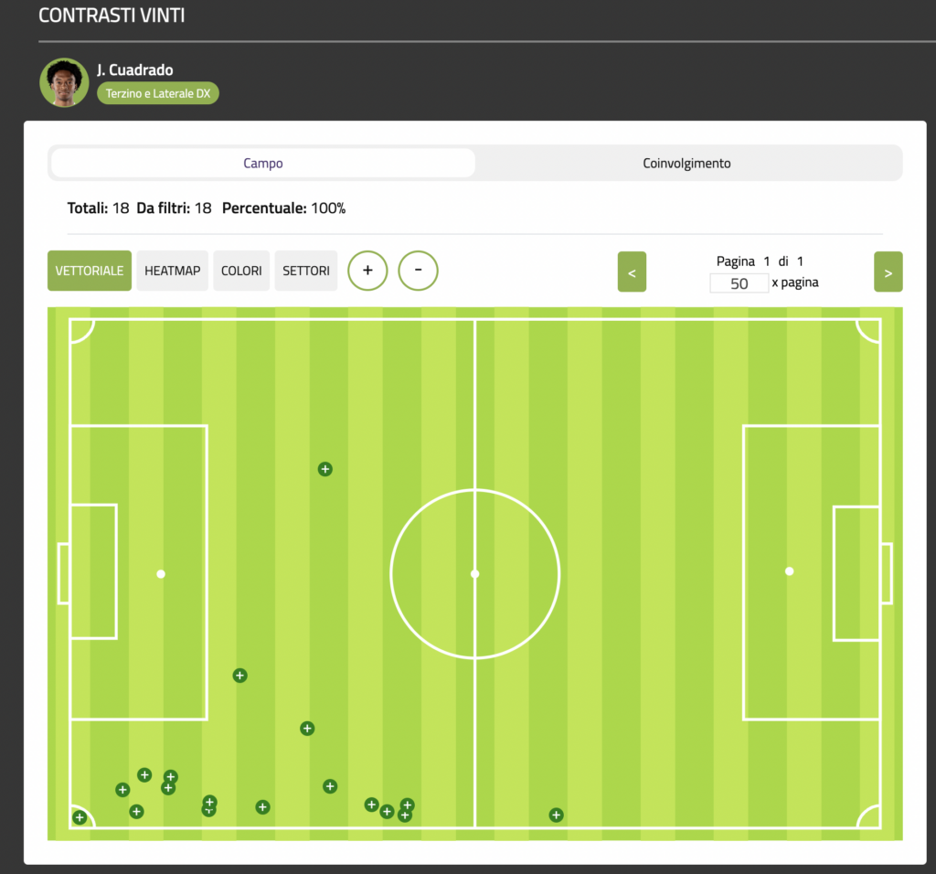 E quanto lavoro fa Cuadrado dietro lo si vede proprio dalle zone dove in questo campionato ha vinto i contrasti: 17 in fase difensiva, solo 1 nella metà campo avversaria