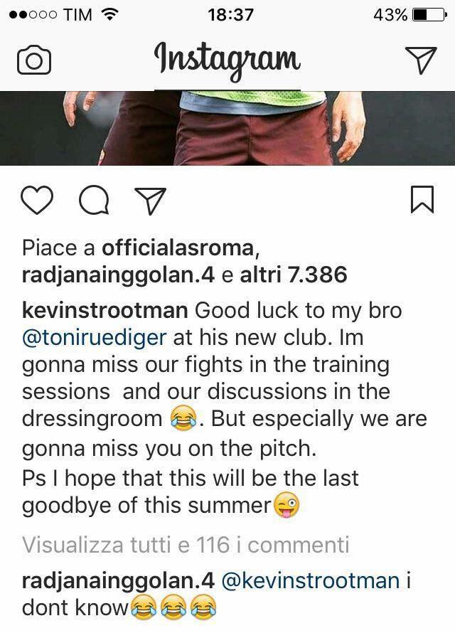 Che Strootman sia uno che non le manda a dire, lo avevamo capito nel corso della sua permanenza a Roma. Il centrocampista olandese non si è risparmiato neanche stavolta, postando il suo personalissimo saluto a Rudiger su Instagram, trasferitosi al Chelsea: «Buona fortuna a mio fratello Antonio Rudiger nel suo nuovo club. Mi mancheranno le nostre lotte nelle sedute di allenamento e i nostri discorsi nello spogliatoio. Ma, specialmente, ci mancherai tu sul terreno di gioco. Ps. Io spero che questa sia l’ultimo addio di questa estate».