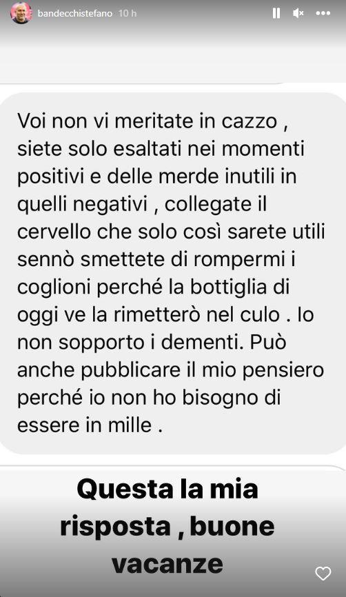 LE PAROLE – «Voi non vi meritate un cazzo, siete solo esaltati nei momenti positivi e delle merde inutili in quelli negativi. Collegate il cervello che solo così sarete utili sennò smettete di rompermi i coglioni perché la bottiglia di oggi ve la rimetterò nel culo. Io non sopporto i dementi. Può anche pubblicare il mio pensiero perché io non ho bisogno di essere in mille».