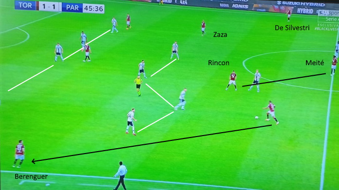 Il Parma allarga a sinistra su Gagliolo, con Rincon che esce su di lui. Ogni giocatore del Parma è preso da uno del Torino, il terzino può solo lanciare lungo su Cornelius che però è circondato da maglie avversarie. I passaggi alti per il danese hanno portato a poco.