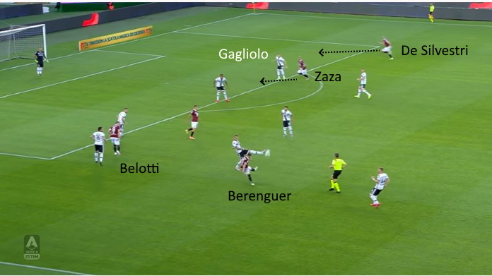 Anche in questo caso, Bremer allarga su un Berenguer che è completamente isolato, in inferiorità numerica contro Darmian e Kulusevski.