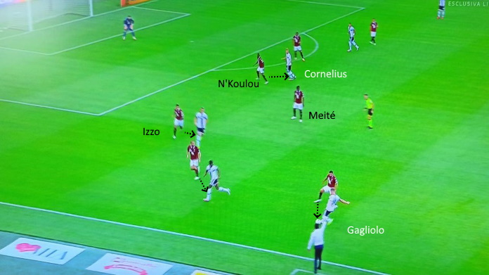 Come si nota anche nella slide sopra, per tutta la gara abbiamo visto Belotti defilarsi spesso a sinistra. In parte avveniva per ricevere palle giocabili, in parte per supportare Berenguer e consentirgli così di puntare l’avversario in parità numerica. A volte, era lo stesso Gallo che riceveva a sinistra ed effettuava cross sul secondo palo per De Silvestri: come quello nel finale di partita, su cui Gagliolo si è immolato.
