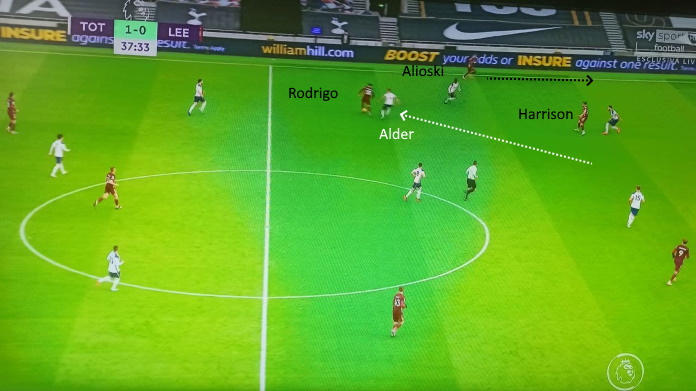 Nelle slide sopra, due situazioni in cui il Leeds crea un’azione pericolosa a sinistra. Nella prima, Rodrigo è bravo a portare fuori posizione Alderweireld, con Alioski sempre che aggredisce bene la profondità (Doherty, il terzino del Tottenham, è stretto perché attirato da Harrison). Nella seconda, il Leeds fa girare bene palla da destra verso sinistra: anche qui Alioski è puntuale a sovrapporsi.