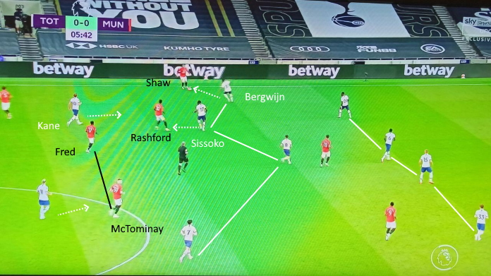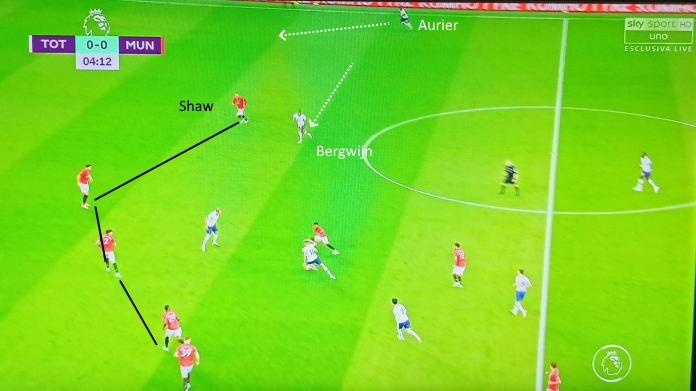 Con il ritorno di Harry Kane e Lamela alle sue spalle, gli Spurs si sono schierati con un 4-2-3-1 (senza palla un 4-4-2) in cui Son e Bergwijn hanno fatto gli esterni. Per la verità, in fase di possesso il Tottenham prendeva le sembianze del 3-2-4-1, visto che il terzino sinistro (Davies) rimaneva bloccato, mentre quello destro (Aurier) si alzava per dare ampiezza. Abbiamo visto però poche volte il Tottenham consolidare il possesso, talmente è rimasto basso nell’arco del match. Questo è un rimpianto per Mou, perché si sono visti alcuni mismatch che si potevano sfruttare: Rashford infatti rientrava poco in supporto di Shaw, di conseguenza a destra c’era una prateria per Bergwijn e Aurier. Una potenziale superiorità numerica che però è stata cercata poco.