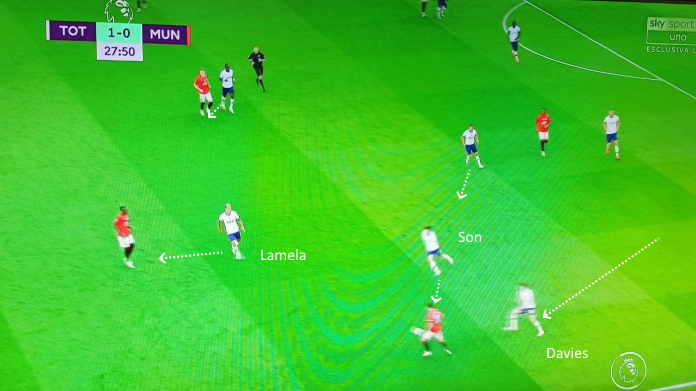 Anche in questo caso, il Tottenham è messo benissimo in fascia: Son supporta Davies, Lamela si abbassa e scherma Wan-Bissaka. In questa slide, si vede anche l’asimmetria dei Red Devils. L’ala (James) dà ampiezza, mentre il terzino (Wan-Bissaka) resta bloccato.